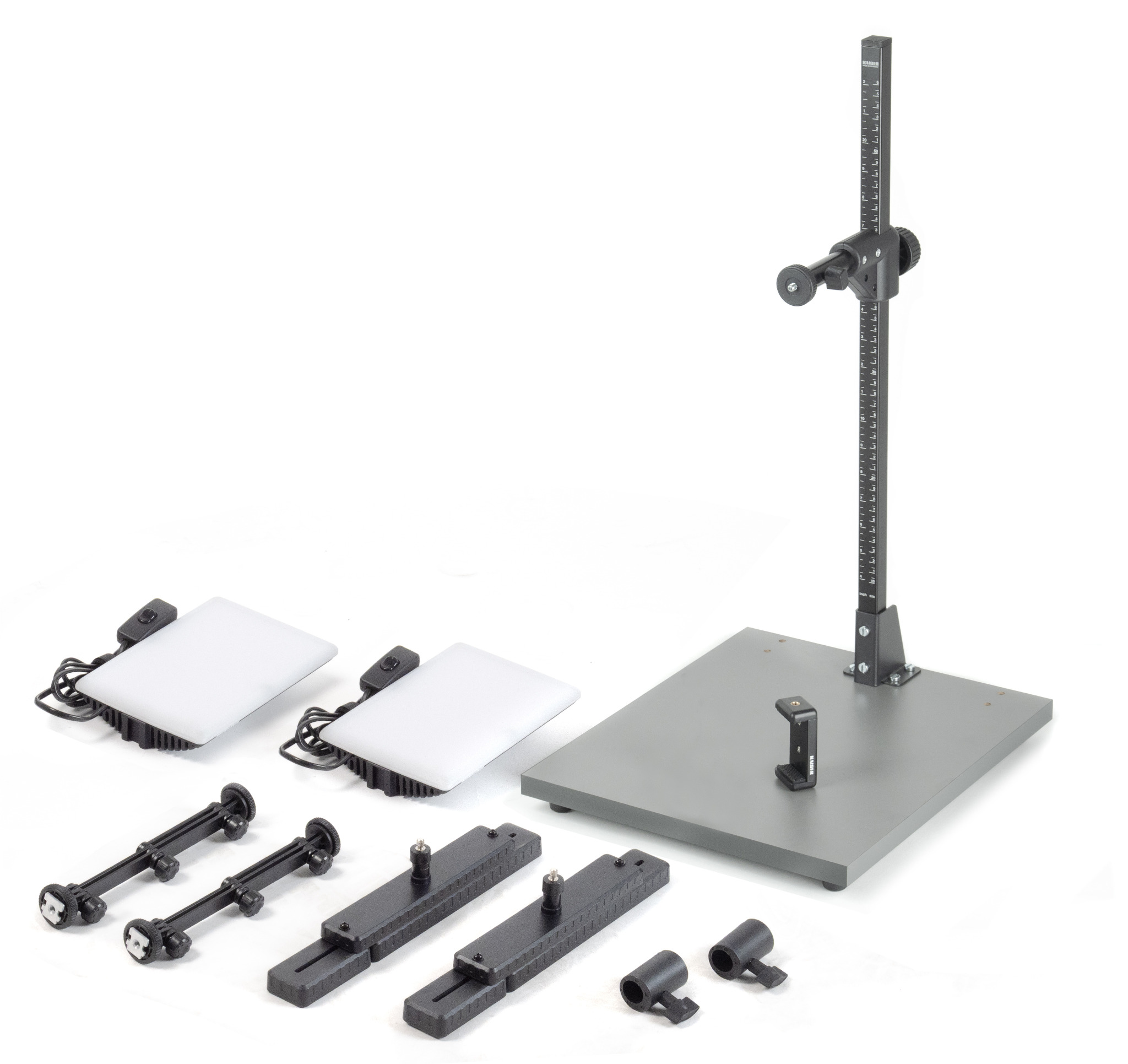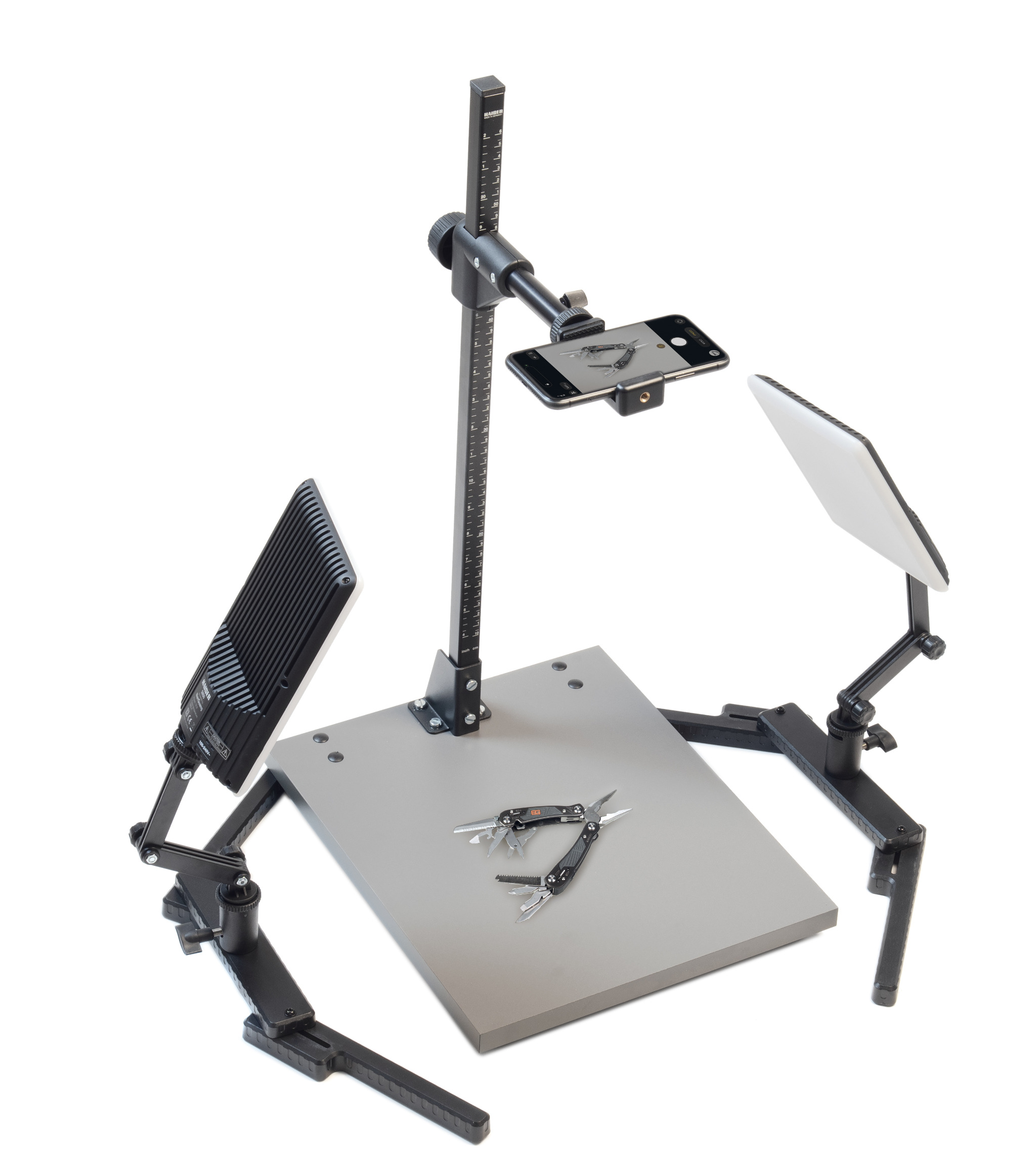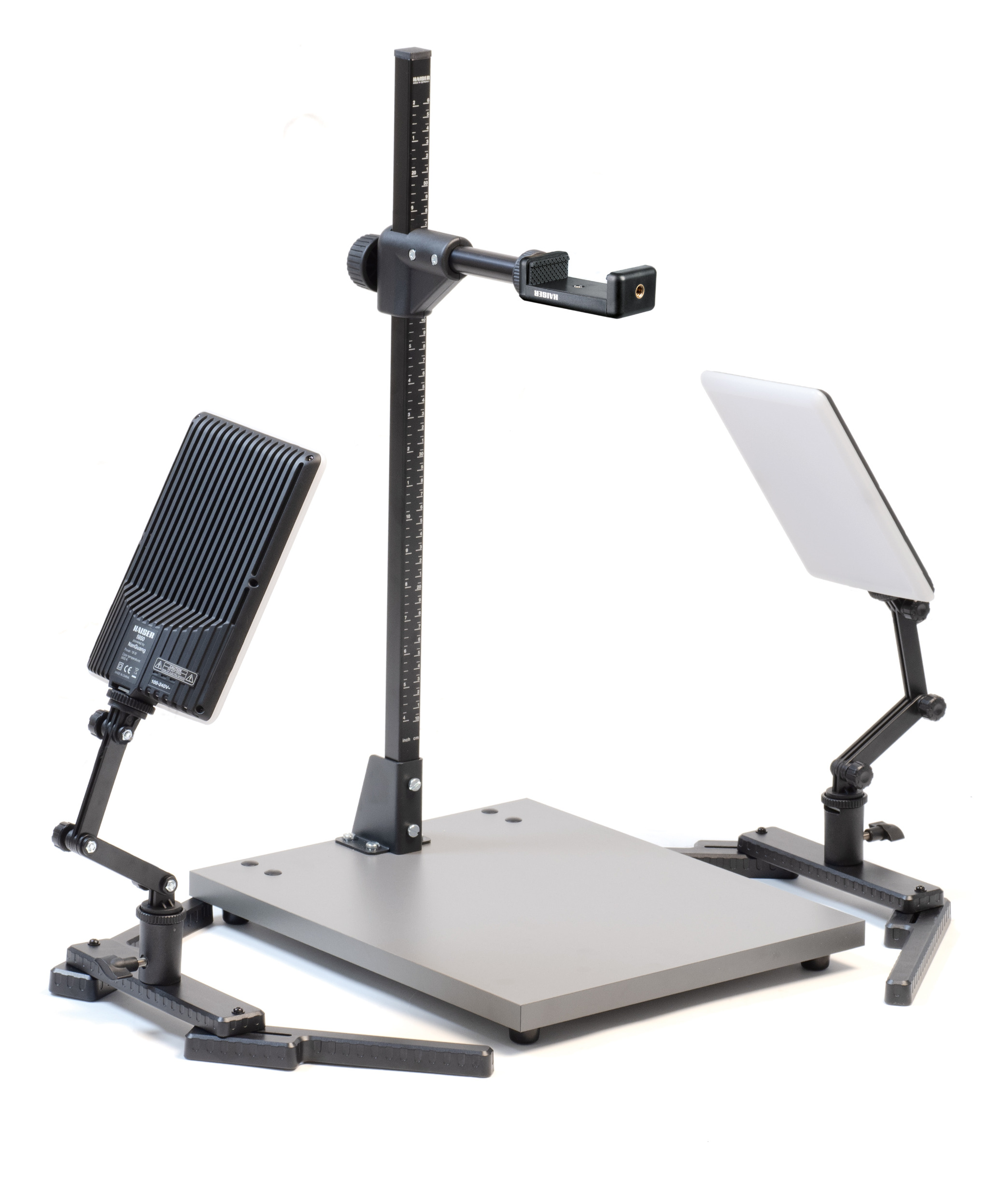 Kompaktes Stativ für kleine, leichte Kameras bis 1 kg oder Smartphones (Befestigung mittels Smartphone-Halter). Reflexfreies, mattgraues Grundbrett 32 x 38 cm (BxT), Führungssäule 59 cm, höhenverstellbarer Kameraarm mit 1/4“-Anschlussgewinde.